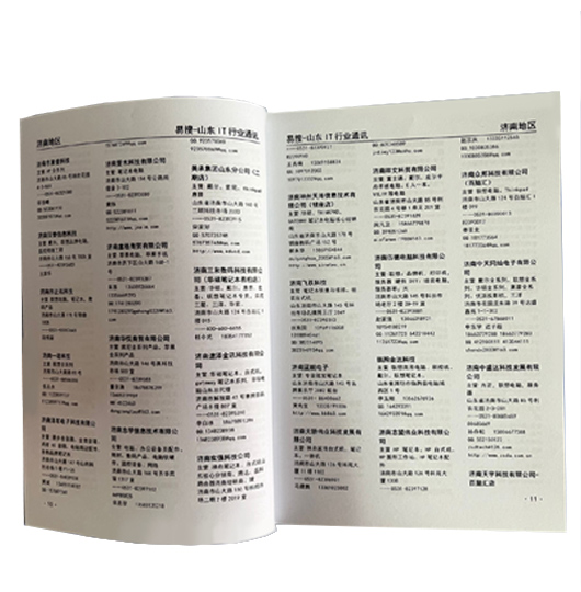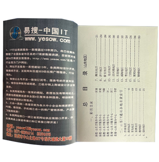 易搜-《山东IT行业通讯录》2022版的封面采用250克铜板纸彩色覆膜精包装印刷,刊头改变以往的全国各地常用的黄色刊头为红色刊头,代表IT行业将更红红火火;内页采用三分栏格式,信息更多更精准,按照山东省各个电脑城和各个路段编排,全书共有360页,我们的员工收录了山东的济南、德州、聊城、菏泽、泰安、莱芜、济宁、枣庄、临沂、日照、青岛、威海、烟台、潍坊、淄博、东营、滨州17个市、139个县所有的渠道商,批发商的名录信息,所有的店面,商铺,柜台等信息,全部按照山东各市编排,商家查找更加方便,快捷,信息量更全, 书的大小统一为32开,以便您随时翻阅查找。