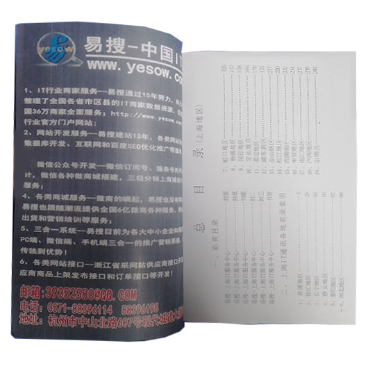 本期的易搜《上海IT行业通讯》封面采用250克铜板纸彩色覆膜精包装印刷,内页采用三分栏格式,信息更多更精准,按照上海市各个电脑城和各个路段编排,全书共有240页,商家查找更加方便,更快捷、准确,为您提供更优质的信息与服务,本书收集了黄浦区、徐汇区、长宁区、静安区、普陀区、闸北区、虹口区、杨浦区、闵行区、宝山区、嘉定区、浦东新区、金山区、松江区、青浦区、奉贤区、南汇区、卢湾区、崇明县等上海19个地区的IT商家信息,内容包括商家电话、手机、联系人、网址等等(QQ、邮箱版本可特别订制,目前,这本《上海通讯录》已全面在易搜商城上预售,现在为回馈上海及全国关注支持的IT朋友们,易搜商城上海通讯录促销价(详见本商城)正在进行中!!!抢先体验,不容错过!快进入http://www.yesow.com/shop/168易搜商城抢购吧! 时间有限,促销仅在易搜商城哦!